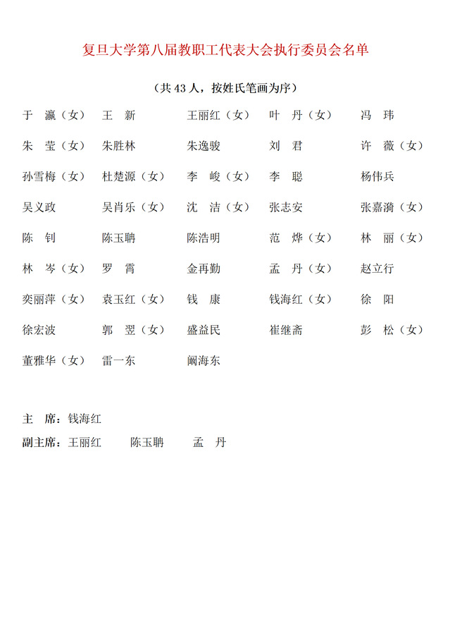 复旦大学第八届教职工代表大会执行委员会名单